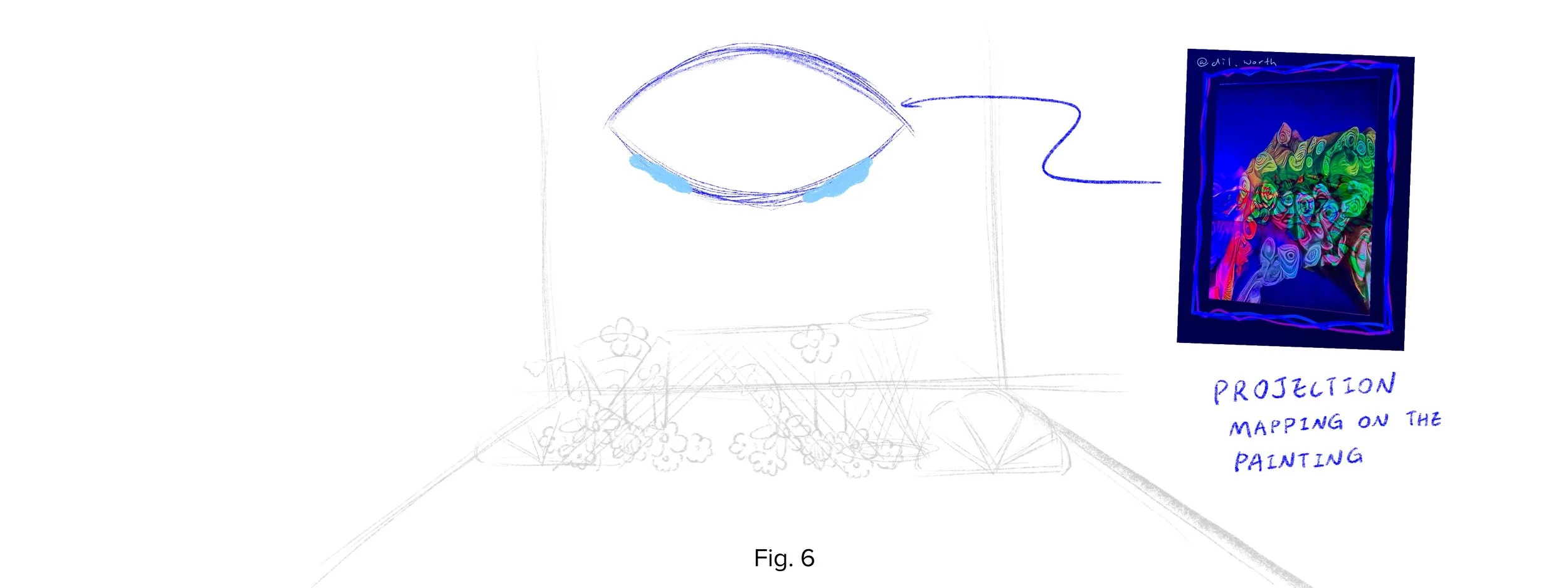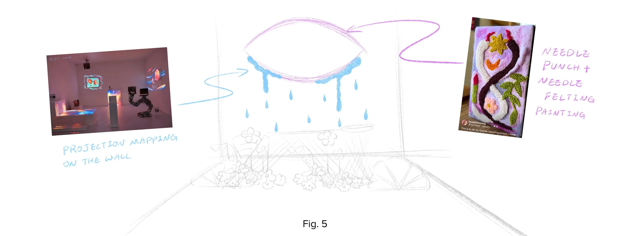The installation features a large eye, with a felt painting hanging on the wall. At the beginning, an animation of tears flows from the eye, projected onto the wall around it (Fig. 5).